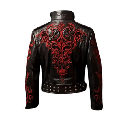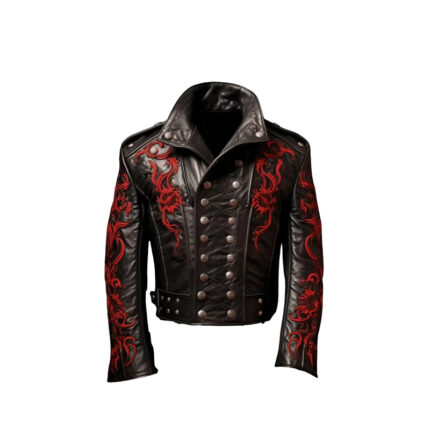 Gothic Dragon Leather Jacket, Black with Red Embroidery