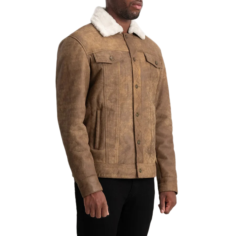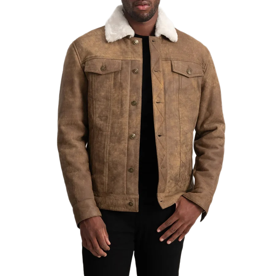 Home Men Fur & Shearling Dallis Distressed Brown Leather Shearling Trucker Jacket