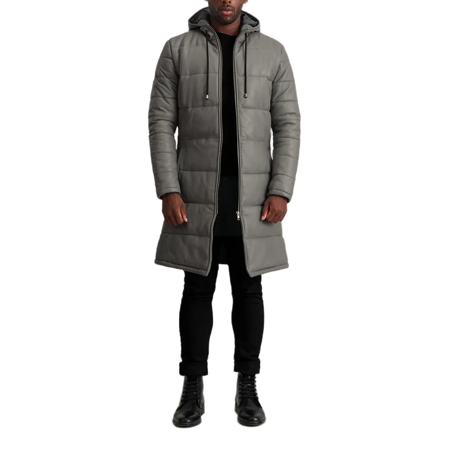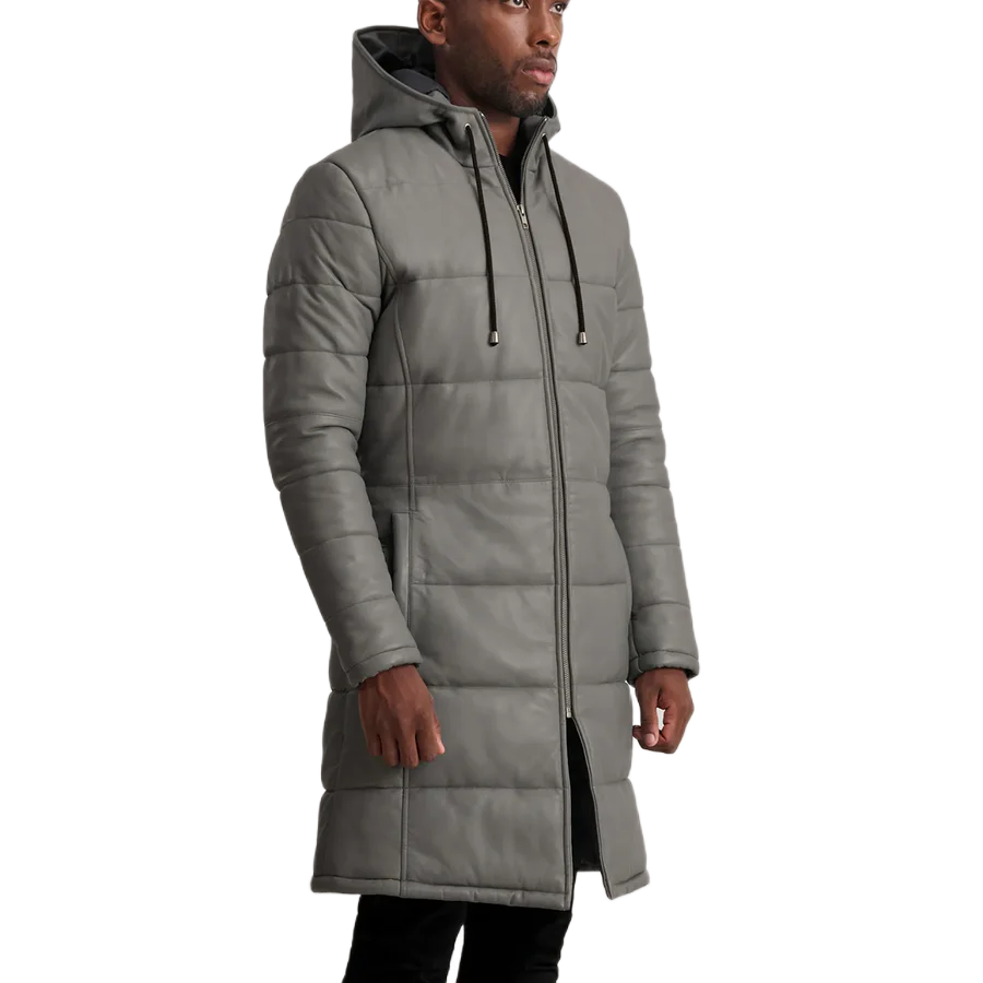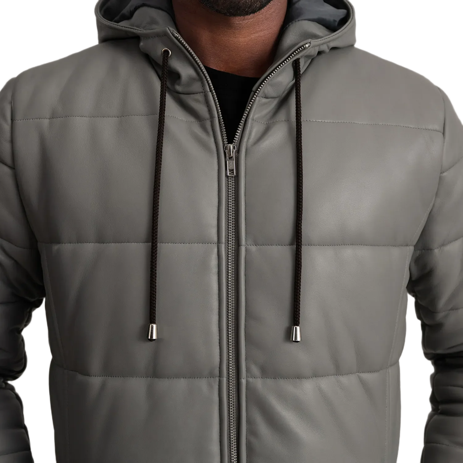 Home Men Puffer Jackets Floyd Grey Hooded Leather Puffer Coat
