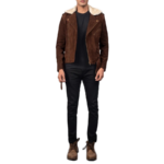 Men’s Dark Brown Leather Bomber Jacket with Shearling Collar
