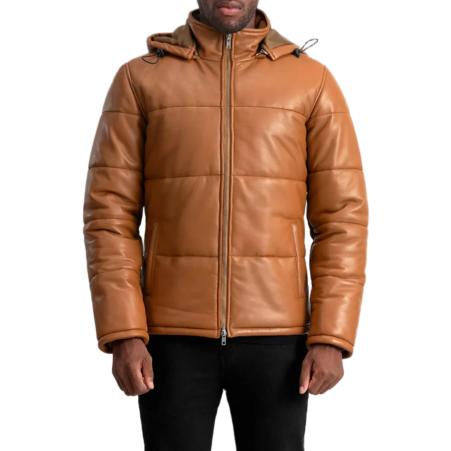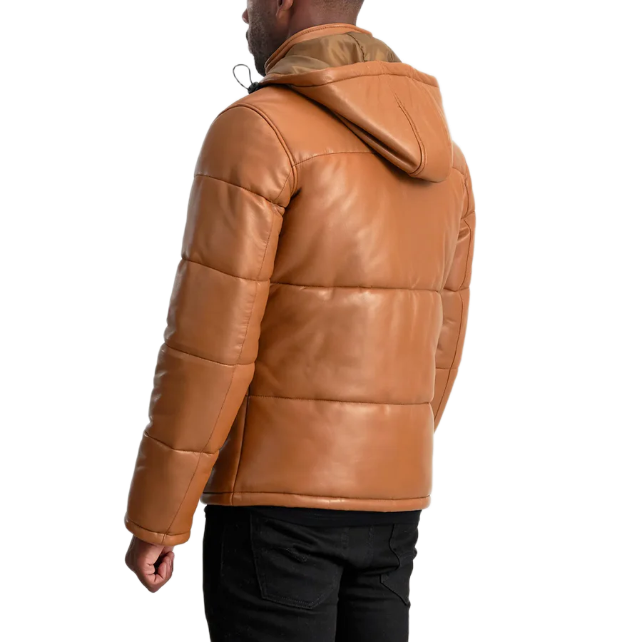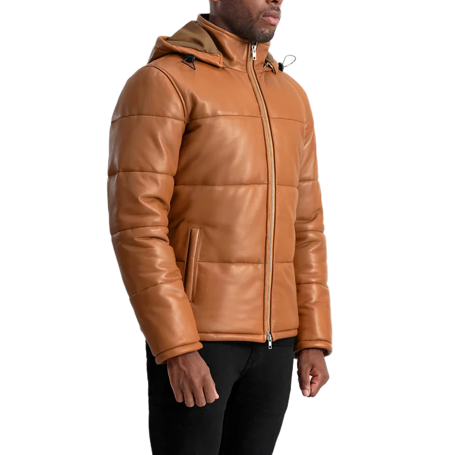 Home Men Puffer Jackets Gordon Tan Hooded Leather Puffer Jacket