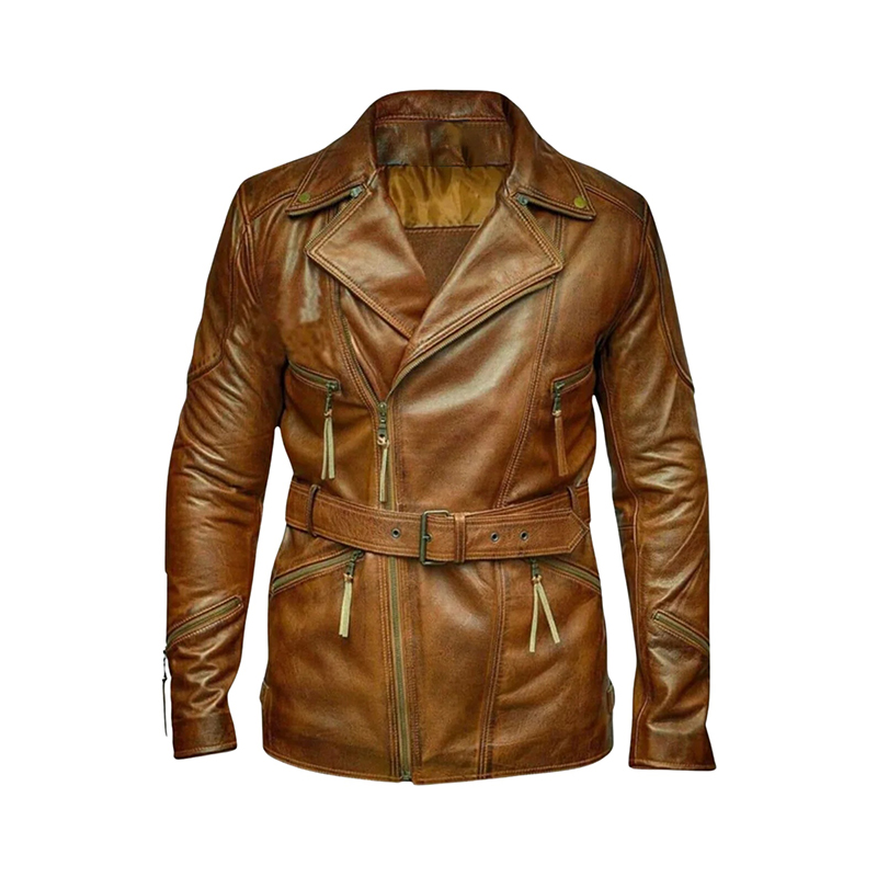 This premium brown sheepskin leather jacket offers a perfect blend of ruggedness and sophistication. The belted waist and asymmetrical zip closure enhance its timeless military look, while multiple external zip pockets provide added functionality. This jacket is made from 100% genuine leather and has lasting durability and style, perfect for both casual and evening wear.